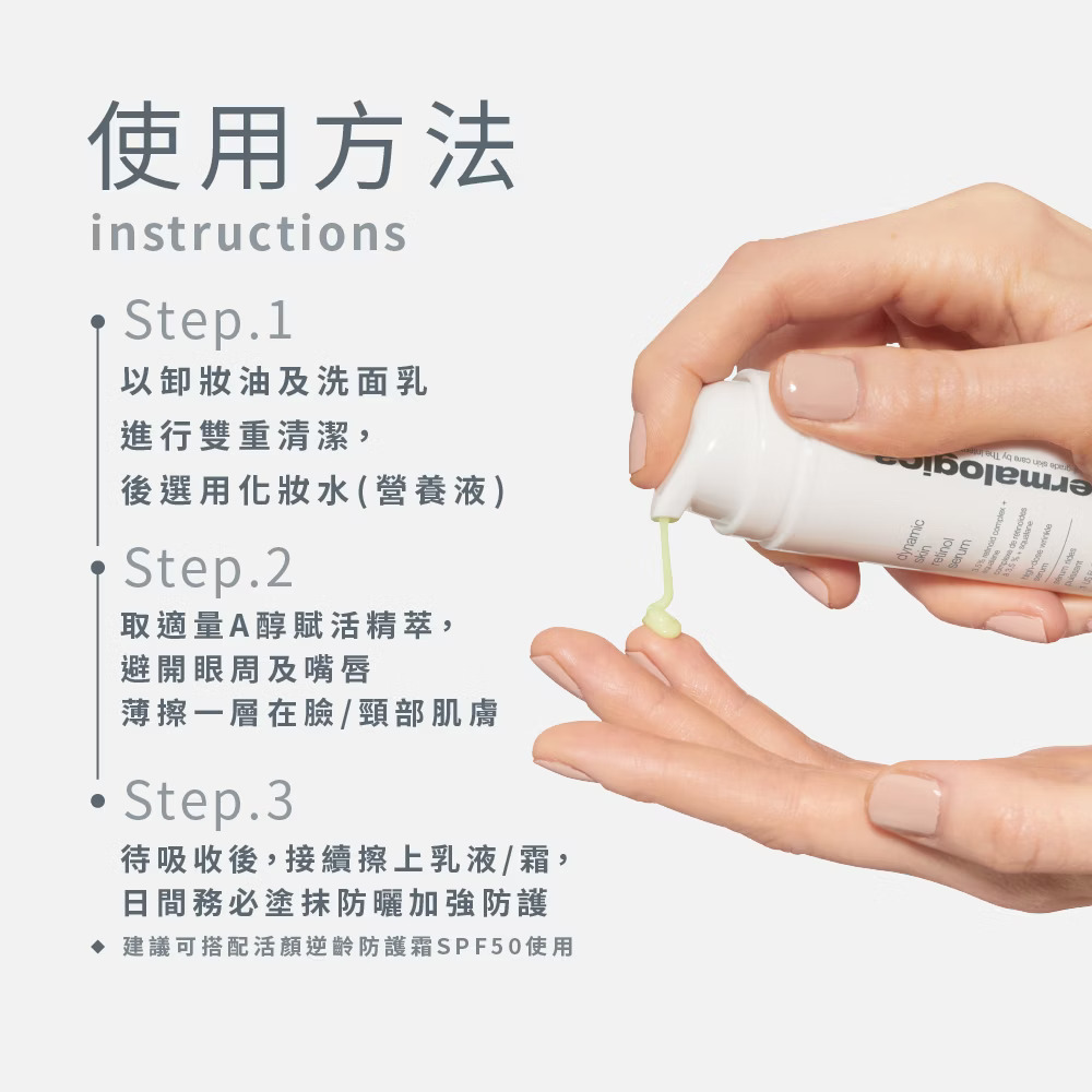 ※初期使用,建議先三天使用一次,待肌膚適應後,再逐漸增加至每晚使用,若出現乾燥泛紅現象請減少頻率