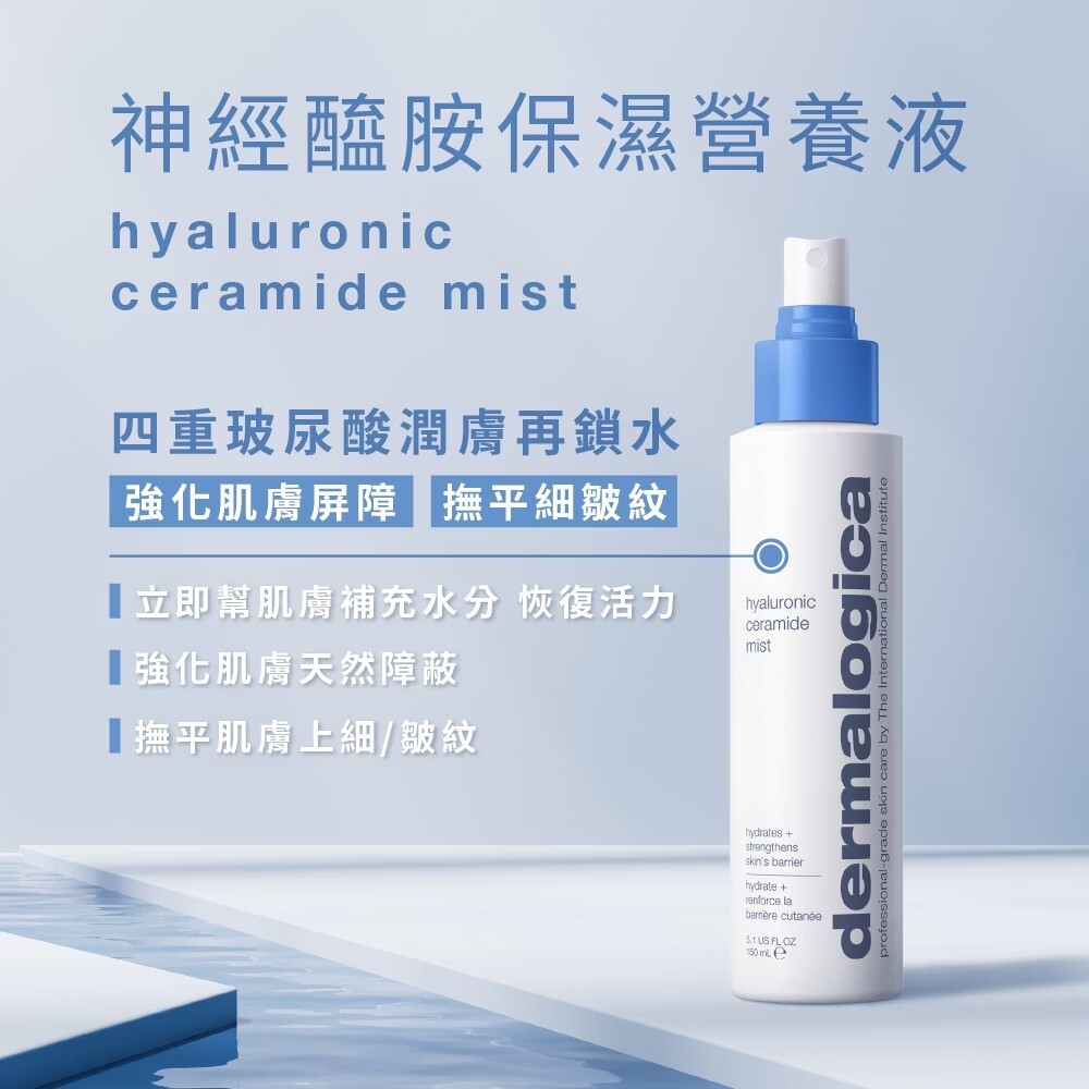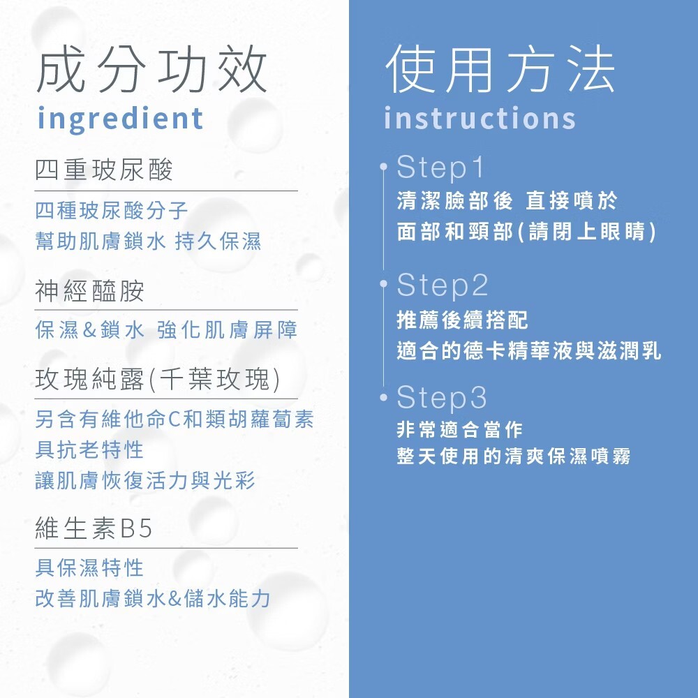 一款含神經醯胺及四重玻尿酸持久保濕噴霧!全天候持續灌注肌底水分,並特別添加玫瑰醇露,使肌膚充滿彈性外又煥發活力光彩。