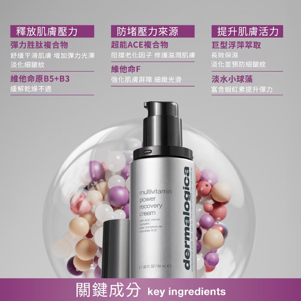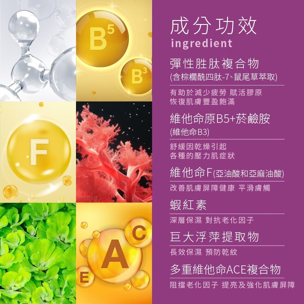 一款專為應對現代生活壓力而生的減壓系乳霜,奶油質地一抹好吸收,富含六種超能維他命A/C/E/F/B3/B5 與彈力胜肽複合物,高效深入肌底,全面提亮修護壓力引起的乾燥、暗沉、細紋鬆弛等肌膚問題,維持水潤度同時增強緊實彈性,讓肌膚重新煥發母胎活力般的健康光澤。