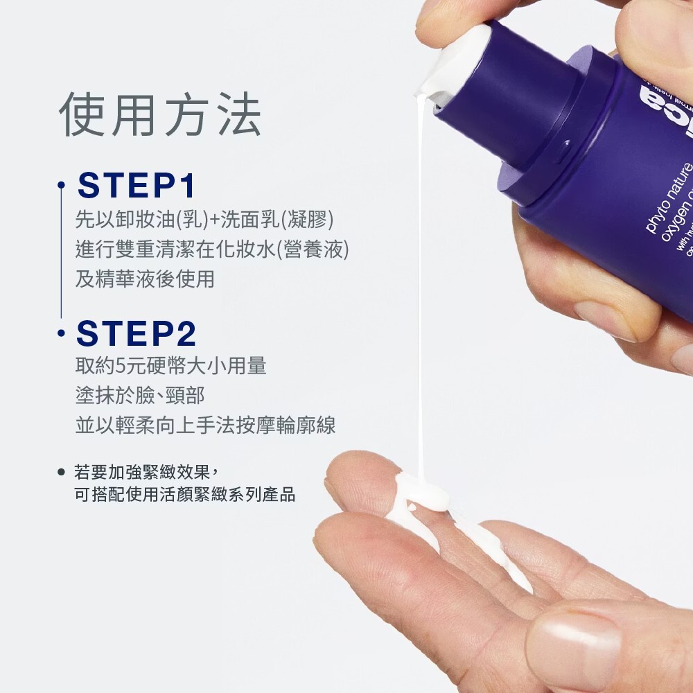 3. 取活顏緊緻氧氣霜約5元硬幣大小用量,以輕柔的向上手法塗抹於臉頸部並輕輕按摩,每天早晚都可使用。