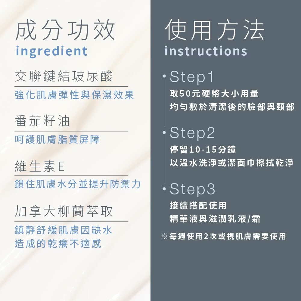 1. 均勻敷於清潔後的臉部與頸部,避開眼睛周圍。