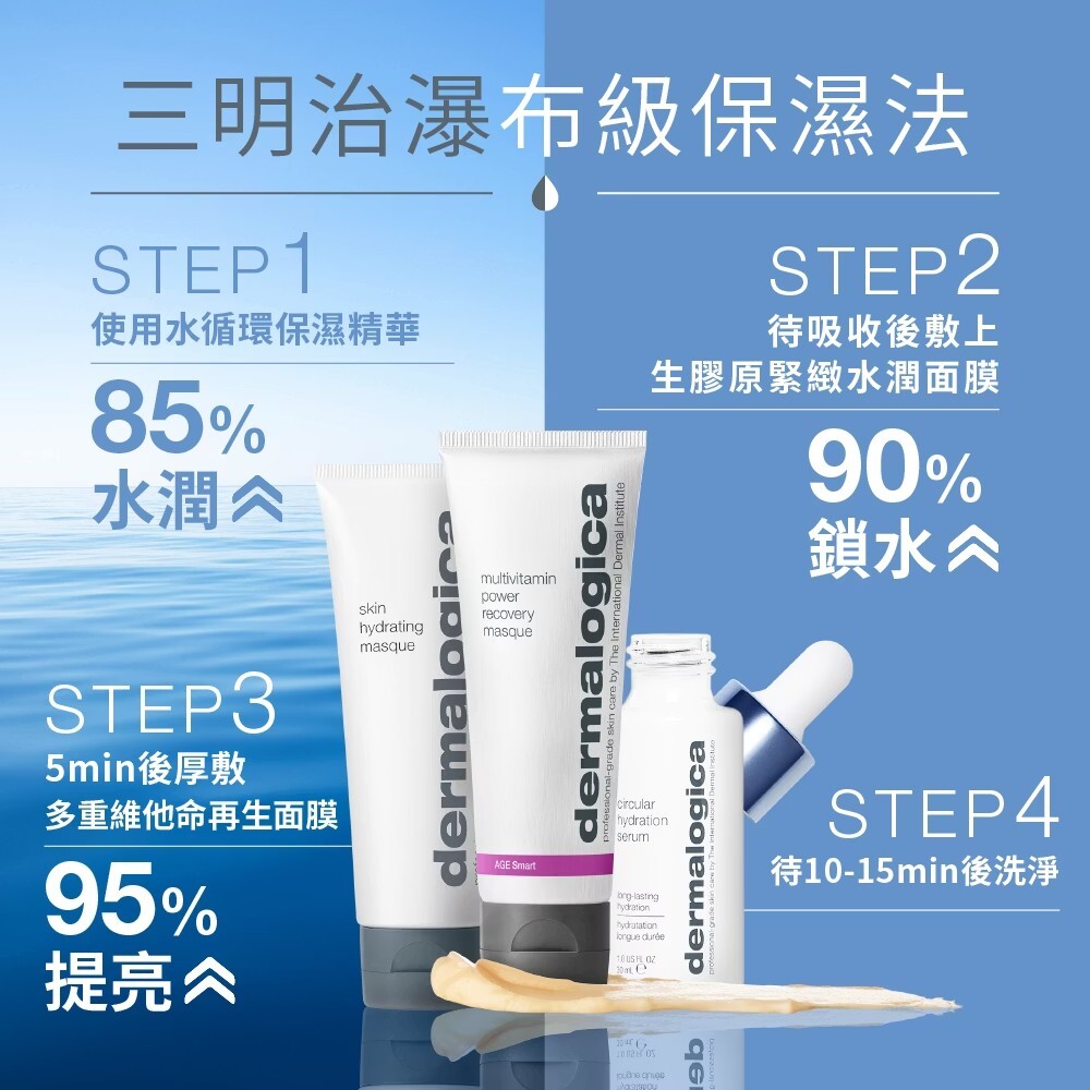 ※為提升速效水潤提亮效果,可先使用水循環保濕精華、待吸收後再敷上生膠質水潤面膜、接續疊敷多重維他命再生面膜,停留15分鐘後洗淨