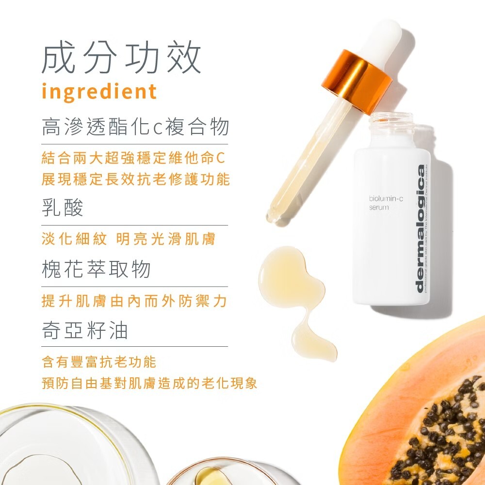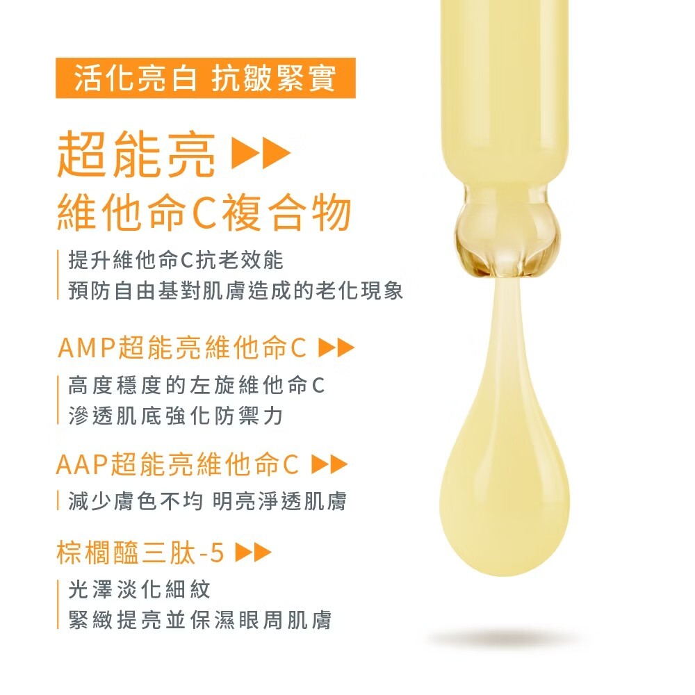 採用革命性超穩定維他命C複合物的高效護膚精萃,不易氧化變質特性,深層滲透肌底增強皮膚天然防禦力,另添加乳酸成分使肌膚年輕緊緻細滑、散發光彩。